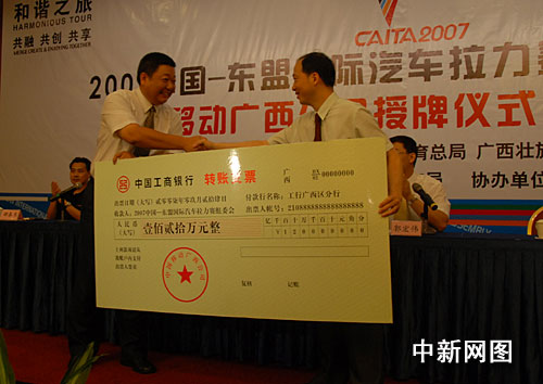 中新网9月26日电 2007中国—东盟国际汽车拉力赛战略合作伙伴中国移动广西公司授牌仪式25日在南宁红林大酒店举行。中国移动广西公司与组委会结成战略伙伴关系,向拉力赛捐赠人民币120万元,并为赛事提供通信支持。