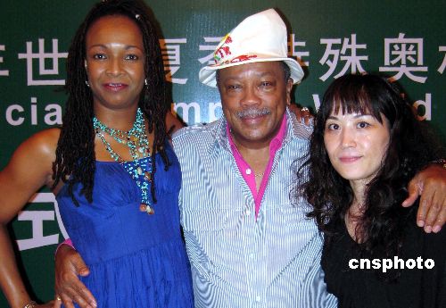 美国流行音乐教父、以一曲“天下一家”蜚声国际乐坛的昆西·琼斯,九月三十日在上海盛赞由其创作的二○○七年世界夏季特奥会主题歌的中文版“你行,我也行”。图为昆西·琼斯(中)与另一位特奥主题歌作者美国创作歌手斯伊达·加莱特(左),及“你行,我也行”的中文歌词作者妮南(右)。中新社发 姜煜 摄