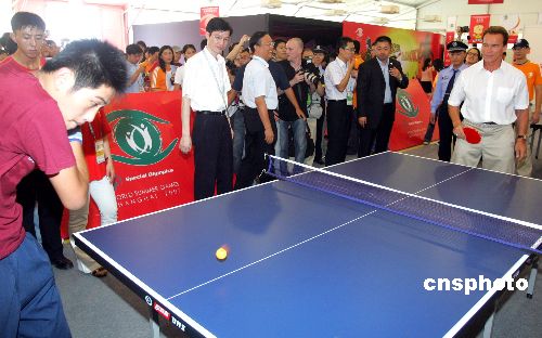 10月3日,美国加州州长阿诺·施瓦辛格(图右)携妻子玛丽亚·施莱佛在上海出席特奥会运动员娱乐中心开幕仪式,并在现场与特奥选手比试乒乓球技。中新社发 汤彦俊 摄
