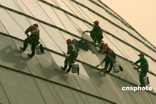 12月9日,北京清洁工人通过吊索悬挂设备清洗国家大剧院玻璃外壳上的尘埃。12月22日晚,国家大剧院将以其华丽的演出阵容拉开国际演出季的序幕。据悉,此次国家大剧院音乐厅开幕庆典将于12月22日至24日举办,包括两场开幕庆典音乐会和一场歌剧精粹音乐会。目前,国家大剧院各项设施全部就位,正在进行首轮演出前的最后准备。中新社发 邹宪 摄