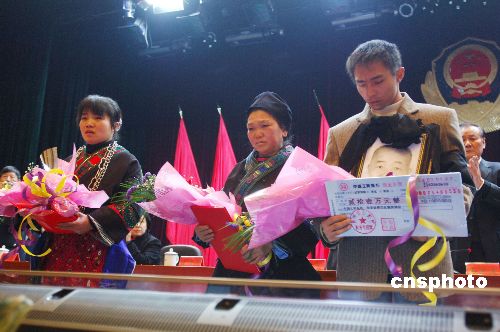 2月4日,贵州省委、省政府召开电视电话会议,表彰抗雪灾牺牲在岗位上的民警欧光权。欧光权是贵州省台江县看守所民警,在抗雪灾一线超负荷工作,1月21日因积劳成疾突发脑溢血倒在岗位上,经抢救无效光荣牺牲,终年57岁。2月2日,公安部部长孟建柱签署命令,追授欧光权为全国公安二级英模。表彰会上有关领导一次性向欧光权的家属颁发奖金21万元。中新社发 吴东俊 摄