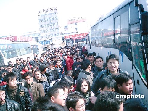 2月4日,安徽省合肥长途汽车站迎来雪后恢复运行的第一个短途客运高峰。由于久雪之后天气放晴,加上临近年关,合肥长途汽车站内旅客激增,当日大约有2万多名乘客拥挤在该站车站内,排成一条条“长龙”。中新社发 张发平 摄