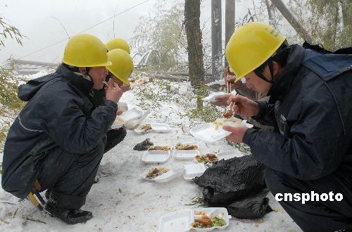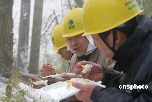 2月6日下午1点,新昌城关供电营业所城区供电服务班班长梁雍和他的队员们一起在施工现场吃中饭。当日,浙江新昌县供电局城关供电营业所的员工在该县城南乡抢修秦岩177线,目前,新昌有35个行政村因雪灾尚未通电,561名电力抢修队员仍奋战在抢修一线。据悉,电力工人们为早日通电,年夜饭也只能在山上吃了。中新社发 袁云 摄