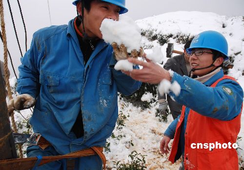2月6日,电力抢修队员在海拨600米的高山雪地里吃年夜饭。据悉,近日雪灾造成浙江嵊州21条主要供电线路中断供电,该市供电局每天出动500余人进行抗灾自救。2月6日,该市供电局200多名党员干部组成6支电力抢修突击队员,对该市贵门、里南、长乐3个未通电乡镇开展春节供电大会战,当晚6时前,该市全面修复供电,实现新春零断电。中新社发 张亮宗 摄