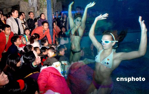 2月8日正月初二,来自俄罗斯远东奥林匹克中心水下芭蕾表演队的俄罗斯姑娘在福州一海底世界表演精彩水下芭蕾,令前来观看的福州观众陶醉。中新社发 刘可耕 摄