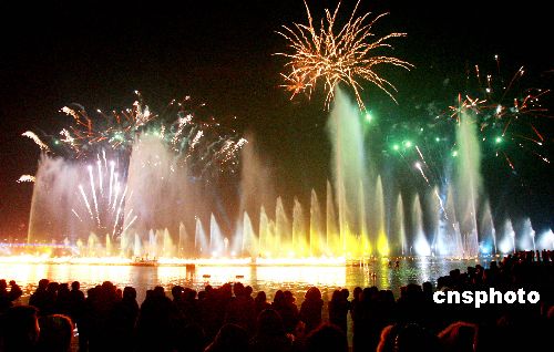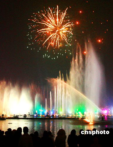 2月8日晚,苏州金鸡湖畔的水景音乐喷泉与璀璨焰火交相辉映。春节期间,苏州工业园区金鸡湖畔每晚一场的大型水景音乐喷泉与焰火表演热闹非凡,为节日之夜营造出浓浓的喜庆氛围,吸引了数千市民及游客蜂拥而至到场观看。中新社发 苏秀 摄