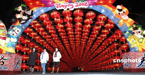 2月8日晚,众多市民和游人纷纷来到大连劳动公园欣赏奥运主题的彩灯。以“辉煌奥运”为主题的2008迎春游园灯会2月7日至2月24日在大连劳动公园举行。本届迎春游园灯会由“喜迎奥运”、“祖国繁荣”、“浪漫大连”、“金鼠送福”、“童话故事”5个系列组织50余盏大型灯组组成。除设灯饰展区外,还设有民俗表演区、南北风味小吃区、游艺游乐区、民间技艺展示区和地面焰火表演区。中新社发 刘德斌 摄