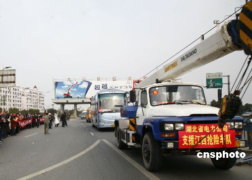 2月10日上午11时许,由171辆车组成的湖北支援江西电网的抢修车队通过九江长江大桥抵达江西,抢修人员将赶赴咸梦线的抢修工地,修复咸梦线江西段134公里长受损电网。中新社发 shendudu 摄