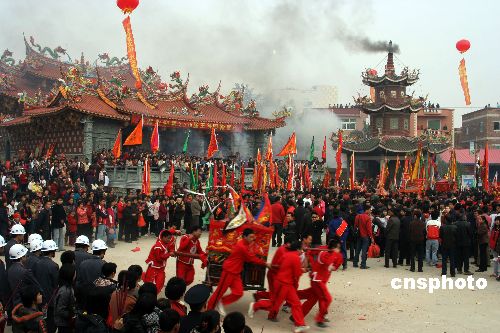 2月10日中午,厦门市同安区西柯镇吕厝村四年一次民间民俗盛事--迎“王船”活动吸引了众多的群众。当地民众信奉的这个王爷叫“代天巡狩”。传说“代天巡狩”神威显赫,总能替天行道,爱护百姓,当地民众都很敬仰他。因而,到了新旧王爷的交接年,当地群众都会举行“送王”和“迎王”庆典,表达他们祈平安庆丰收的心情。通常,申子辰年(鼠、龙、猴年)为新旧王爷交接年,交接年间的正月初四为迎接新任王爷的盛会,同年的农历十月择日欢送原任王爷,形成了四年一任的民间迎送王爷的盛会。中新社发 吉辛 摄