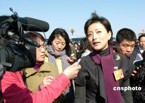 图为政协委员杨澜接受记者采访。3月3日下午,中国人民政治协商会议第十一届全国委员会第一次会议在北京人民大会堂开幕。委员们积极参政议政、献言献策,进出人民大会堂时被中外记者团团围堵。中新社发 毛昭胜 摄