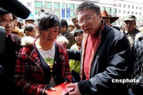 3月22日,拉萨一服装店门前,中国新闻社西藏分社社长柳俊武向受害者卓嘎捐助善款。在拉萨3月14日发生的打砸抢烧破坏活动中,该服装店的五名女员工被活活烧死在店中,卓嘎是当时的幸存者。中新社发 廖攀 摄