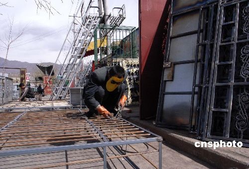 三月二十四日,拉萨市内集中经营防盗门窗的市场内,工人正赶制产品。近来,拉萨防盗门窗业务激增。中新社发 廖攀 摄
