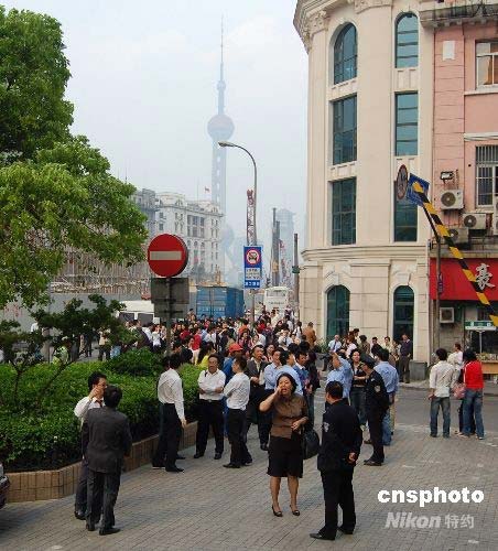 据上海市地震局刚刚提供的消息,中国地震台测定,5月12日14时28分在四川汶川县发生7.8级地震,上海高层建筑普遍有感,但不会对上海造成危害。图为位于市中心35层的上海工商联大厦楼前聚集的慌忙跑出的人群。中新社发 段更强 摄