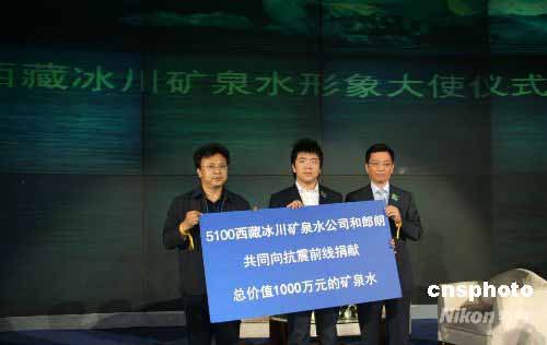 5月25日,5100西藏冰川矿泉水与其形象代言人郎朗联名,通过中国红十字会,共同为四川地震灾区捐助总价值一千万元的矿泉水。由于地震灾区供水设施毁坏严重,清洁的饮用水成为灾区最紧缺的用品之一。早在5月12日大地震当天,5100已迅速将数车矿泉水送往抗灾前线。中新社发 魏晞 摄