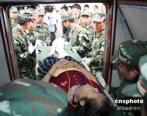 5月29日,徐州火车站,武警战士小心地将伤员抬下火车。当天,130名四川地震灾区伤病员乘坐“救28/7次”特殊专列顺利抵达江苏徐州。抵达后,他们迅速被安排到徐州市第一人民医院、徐州医学院附属医院等市区四家大医院做进一步治疗。中新社发 蔡广银 摄