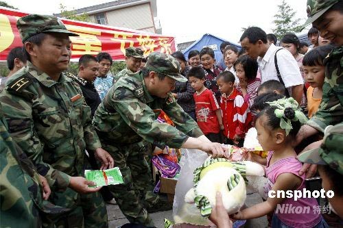 五月三十一日,四川省都江堰市紫坪铺镇望江村的孩子们收到了部队赠送的儿童节礼物。四川预备役高射炮步兵师四团负责都江堰市望江、黎明、白沙三个行政村的救灾工作。儿童节前夕,该团为孩子们准备了书包、玩具,送给当地的孩子们。中新社发 慎重 摄