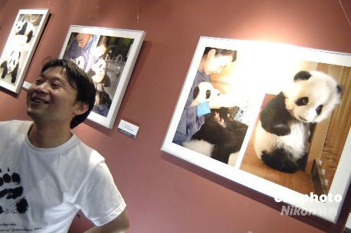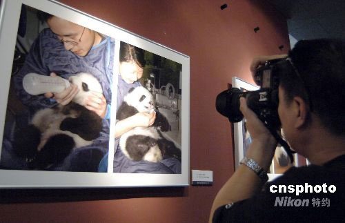 9月18日,《与大熊猫同在》摄影展在北京“大众影廊”开幕,展示“5.12”汶川大地震后,四川卧龙保护大熊猫研究中心工作人员拍摄的近40幅摄影作品,记录了救护国宝的一个个感人瞬间。震后出生在雅安碧峰峡基地的第一对双胞胎熊猫宝宝照片,成为影展的焦点。中新社发 徐曦弋 摄