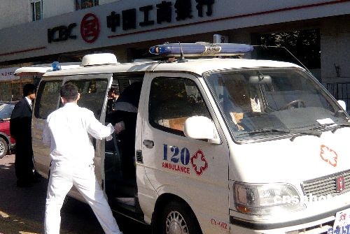 11月15日中午,北京一家工商银行一位正在办理个人业务的老人突然昏迷休克倒地,银行工作人员立即呼叫120救护车前来进行抢救。中新社发 钱兴强 摄