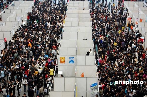11月15日,由重庆市大学中专毕业生就业指导服务中心联合学校、企业与职业生涯发展机构等多方力量,共同为09届的高校毕业生筹划举办的双选会系列活动,首场也是规模最大的一场双选会在陈家坪展览中心举行,万余人次09届毕业生参加。 从招聘会上看到,由于受到全球金融危机的影响,企业纷纷“瘦身”,大幅缩减招聘人数,毕业生面临“僧多粥少”的局面,就业遭遇寒流。中新社发 许康平 摄
