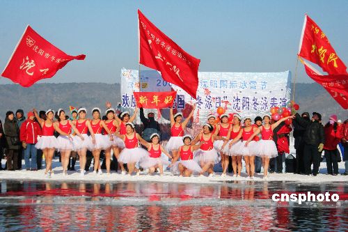 2009年1月1日,辽宁省沈阳市欢度新年暨全国“冬泳日”冬泳表演在棋盘山冰雪大世界秀湖举行。150多名冬泳爱好者进行了“天鹅湖”表演及跳水表演。中新社发 刘宝成 摄