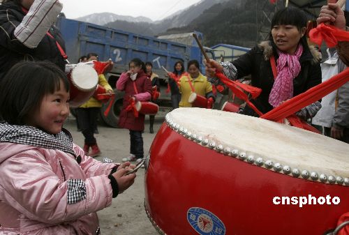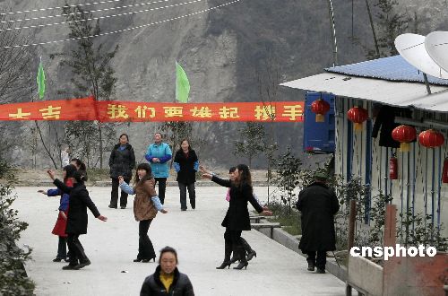 1月23日(腊月二十八),四川汶川县映秀镇在街头吊挂起红灯笼,给小镇带来了节日气氛。连日来,四川省藏族阿坝自治州汶川县映秀镇村民抓紧排练歌舞喜迎春节。中新社发 张晓理 摄