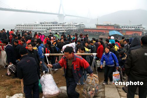 2月3日农历正月初九早8时,长江宜昌港大公桥客运码头四条趸船无一客人、无一客船,9时,9艘客船同一船闸、同时停泊宜昌港,一时间,涌入宜昌港口的出川大军疏散成“井喷”之势。宜昌海事、公安、港口等部门联动执法,35分钟时间内紧急疏散4500余人,全部是出川农民工。据统计,三峡春运期间,常年旅客进出客流量约50万人次,其中外出农民工乘船超过40余万人次。据悉,三峡库区是长江干线跨省春运重点航线,而这一航线又是中国内河农民工乘船的专营航线,节前单边返乡过年,节后单边出川进城打工,客船单边旅客、客船高度集中,是中国内河不多见的春运现象。中新社发 望作信 摄