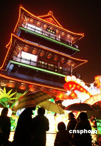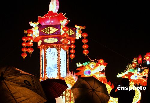 2009年2月2日晚,江苏省盐城市在刚落成不久的盐镇风情文化水街开始举办首届新春灯会,主题为“盛世中华和谐盐城”。用“龙腾盛世”、“鹤鹿同春”等一组组流光溢彩的灯饰造型着力展现“东方湿地之都,仙鹤神鹿故乡”的独特风采。虽然有连绵的阴雨,市民赏灯的激情却丝毫没有削减,一个个打伞赏灯的身影游动在绚丽缤纷灯海中,使灯火点缀的仿古景区更添几分情趣。中新社发 李根 摄