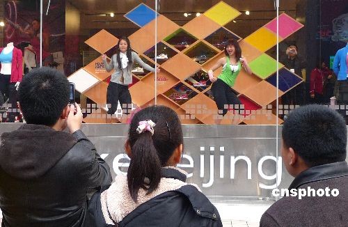 2009年2月21日,北京王府井某商场,两位模特在橱窗内激情表演动感十足的舞蹈,以此吸引过往行人的目光,为商场增添人气。中新社发 玉龙 摄