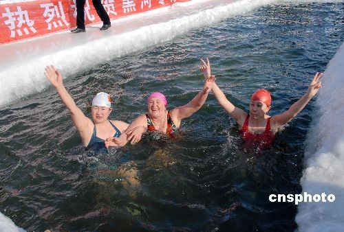 3月8日,中俄边城15名妇女冬泳爱好者在界河黑龙江冰池中畅游,共同欢度第99个“三八”国际劳动妇女节。中新社发 邱齐龙 摄