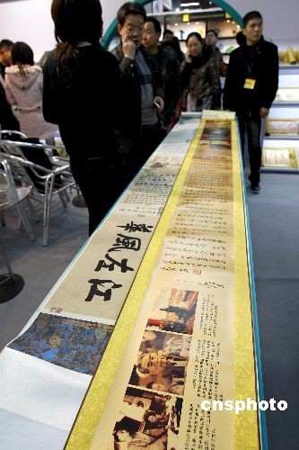 3月9日,第十九届北京国际礼品工艺品暨家用精品展会在北京国际贸易中心开幕。本届展会总面积达15000平方米,共有800多个展位,汇集了700多家参展商,适合不同人群的需求,让市民可以体验一站式采购的服务。图为中华第一宝典“开国大典”丝绸工艺品长卷亮相北京礼品展吸引不少市民的目光。中新社发 郑雄增 摄