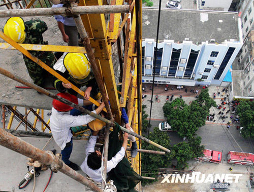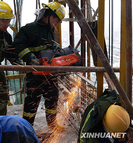 4月11日,在广西北海市深圳路一个施工工地,消防官兵正在营救被困工人,被困者身穿蓝衣,手脚被升降机吊架卡住。当日上午,在广西北海市深圳路一个施工工地,一名工人不慎被升降机吊架卡住困在19楼。北海市消防支队官兵接到报警后迅速赶赴现场,用切割机切断钢板,及时将被困工人救出送往医院救治。由于救援及时,该工人无生命危险。