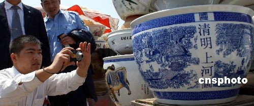 近日,一只青花瓷《清明上河图》花盆亮相江苏省苏州市一家陶瓷精品店。据悉该花盆由景德镇一名艺人,按原图1:1比例手工制作而成。 中新社发 李俊锋 摄