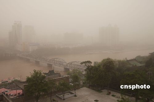 4月23日,甘肃省兰州市出现浮尘天气,城区一片朦胧。甘肃敦煌、玉门等多地遭遇沙尘暴侵扰,这是今年以来甘肃省出现的首次区域性沙尘暴天气。中新社发 殷春永 摄