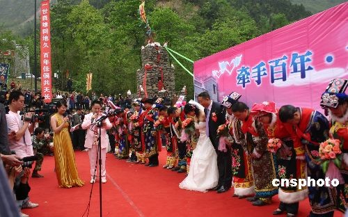 4月26日,在北川集体婚礼现场,20对新人鞠躬感恩社会的关爱和帮助。中新社发 霍潺 摄