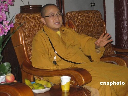 2008年5月12日,四川省地震极重灾区什邡市罗汉寺住持素全法师在危难时刻,将禅房当“产房”,先后接纳百多个无家可归的产妇,使108个婴儿诞生在这片佛门清净之地,从此什邡罗汉寺108个“罗汉娃”美名远播海内外,在中国佛教史上写了浓墨重彩的一笔。图为素全法师接受中新社记者专访。中新社发 肖龙联 摄