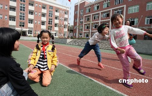 5月初,王彬与同学们开心地跳皮筋。梁平县在“5·12”大地震中是重庆市受灾严重的地区。在教学楼垮塌后,王彬为回去寻找还未能逃离的老师和同学,不幸被垮落的水泥板“切”掉右臂。目前,王彬已能用左手熟练地自理生活和学习,她说最大愿望是将来参加残奥会。中新社发 郭晋嘉 摄