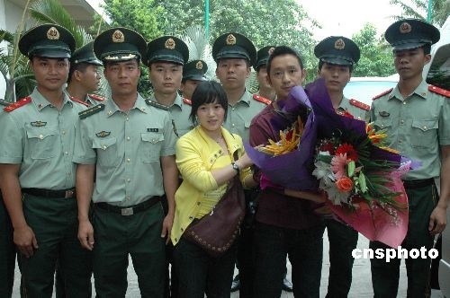 5月8日中午,四川北川羌族女子易欣(中)和北川两位姐妹乘飞机从成都抵达海口,寻访一年前将她们从地震废墟中救援出来的海南省地震救援队的专家和官兵。图为易欣和海南省地震救援队的救援官兵合影。中新社发 王辛莉 摄
