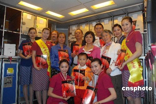 5月8日,南航CZ3101航班早上8点准时从广州白云机场起飞。据介绍,这是南航招收的奥运空姐正式单飞的首个航班。这两名身披明黄色绶带的空姐将在航班上与旅客一起举办“南航奥运空姐迎亚运,为亚运加油”的主题活动。中新社发 陈卫华 摄