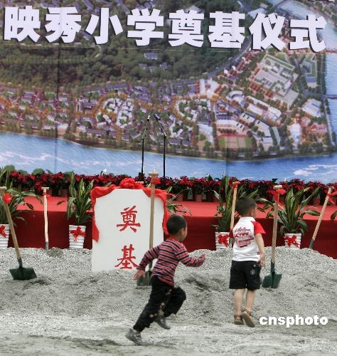 5月11日,四川省汶川县映秀镇灾后恢复重建项目开工暨映秀小学新校舍奠基仪式举行。映秀小学在地震中校舍彻底倒塌,孩子们在板房上课至今。新校舍由深圳证监局捐建,用地10446平方米,其中绿地面积大于35%,总投资2951.6万元,拟建6层,可容纳12个班,学校运动场作为临时避灾场地。预计工期5个月。 同期开工的还有包括映秀幼儿园、中滩堡大道、渔子溪大桥和映秀镇安居房等映秀镇灾后恢复重建项目。中新社发 张晓理 摄