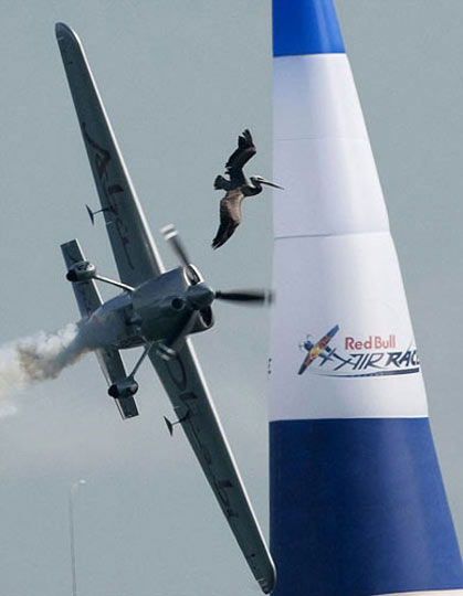 据英国媒体11日报道,“红牛竞飞世界巡回赛” 最后一轮比赛10日在美国圣地亚哥举行,观众们在欣赏惊心动魄的特技飞行表演的同时,还意外看到了一幕“恐怖小插曲”——一只大鸟欲与高速飞行的飞机争夺“制空权”,最后被飞机的螺旋桨生生击碎!