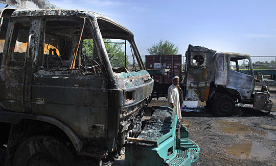 巴基斯坦电视台13日报道,驻阿富汗联军运送物资的数辆卡车当天在白沙瓦市遭遇武装分子火箭弹袭击,多个集装箱被烧毁。
