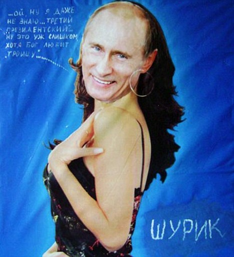 普京一向以“硬汉”形象示人,如今一个心怀不满的画家,竟然将这个“硬汉”画成一个身穿低胸吊带紧身裙,拥有一头波浪长发,并戴着大耳环的女人。这名画家已经被俄罗斯秘密警察拘捕。对于自己涉嫌羞辱总理的行为,该画家解释说自己是对普京还想当总统一事表示抗议。