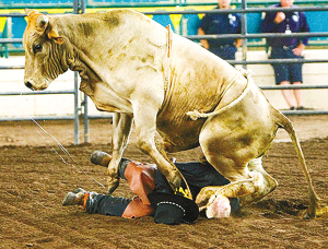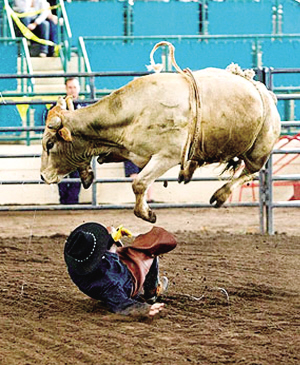 据英国《太阳报》、《每日镜报》7月7日报道,日前美国加利福尼亚州一年一度的放牧人竞技会在加州圣迭戈举行。与往年一样,骑公牛表演仍是竞技会上最激动人心的表演。不过,今年的骑公牛表演却发生意外一幕,一头狂躁的公牛把一名年迈的骑手掀翻在地,飞蹄狂踩,所幸在工作人员帮助下这名骑手只是轻微受伤。