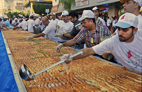 7月18日,在约旦河西岸城市纳布卢斯的糕点师用1700多公斤材料制成了约74米长的阿拉伯甜点,希望以此打破吉尼斯世界纪录。