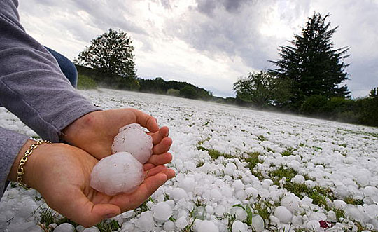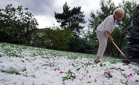 7月23日,在瑞士洛桑附近的莱埃塞特,人们正在清理落在自家花园中的冰雹。瑞士西部当天下午遭受了一场冰雹袭击。