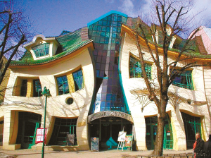 波兰波特市一家生意兴隆的购物中心的附属建筑成为当地著名旅游景点。它建于2004年,楼身呈扭曲的褶皱形,就像一栋喝醉酒后醉态可掬的卡通房子。