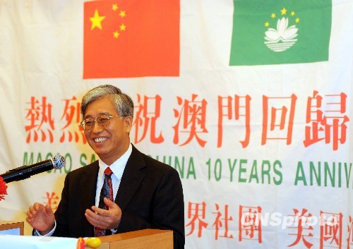 洛杉矶侨界代表两百多人十一月六日晚欢聚一堂,共同庆祝澳门回归祖国十周年。中国驻洛杉矶总领事张云在会上发表专题演讲,并向领区澳门籍侨胞致以诚挚问候和热烈祝贺。中新社发 张炜 摄