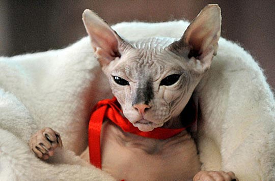 11月7日,在吉尔吉斯斯坦首都比什凯克举行的猫展上,一只系着缎带的加拿大无毛猫躺在毛毯中。加拿大无毛猫又称斯芬克斯猫,是经由原本无毛或少毛的纯种猫基因突变而成。加拿大无毛猫全身只有一层细小的绒毛,尤其是脸、耳、脚和尾巴等部位。