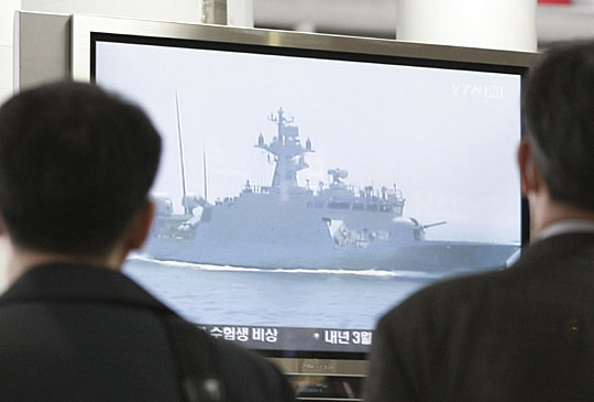 11月10日,韩国民众在首尔市火车站内观看朝韩海军舰艇在西部海域交火事件的新闻。当地时间10日上午11时28分左右,朝韩海军舰艇在西部海域发生交火。