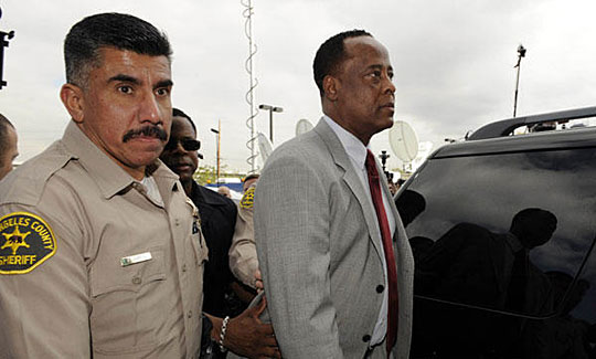 2月8日,已故美国流行歌星迈克尔·杰克逊的私人医生康拉德·默里(右)抵达洛杉矶一家法院。他将面临过失杀人罪指控。杰克逊去年6月25日去世,洛杉矶法院和洛杉矶县验尸官办公室认为杰克逊的死因是注射致命剂量的麻醉剂丙泊酚和其他镇静剂。默里承认曾为杰克逊实施注射,但他否认自己有任何过失。